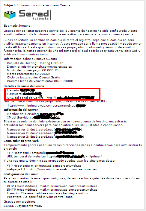 Si el hosting o espacio web que tienes es el de ComoCrearTuWeb, o de Sered, o de Allinhosting o similar, habrás recibido en tu E-Milio un correo informándote de cuáles son tu usuario y tu contraseña. Algo así como esto: