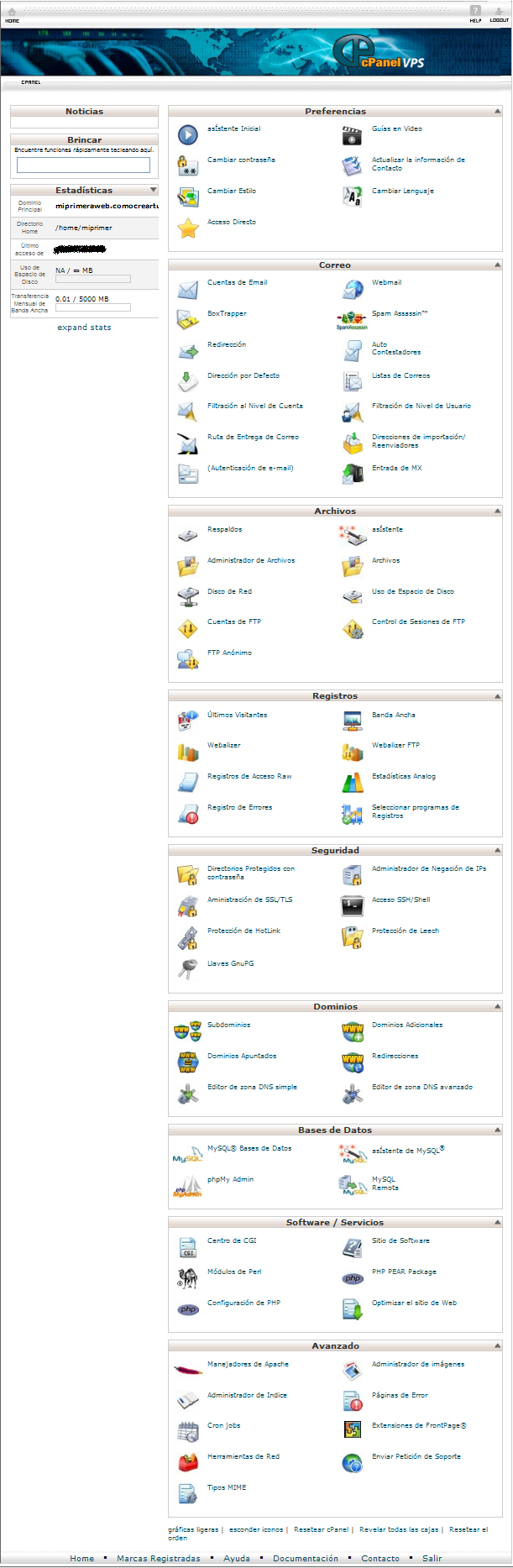 Si no quieres que aparezca más esa ventanita puedes activar la casilla que aparece en la parte inferior de la misma. Yo la dejaría desactivada, para que vuelva a aparecer, por si alguna vez quieres ojearlo. Si cierras esa ventana verás por fin el menú del Cpanel con todas sus opciones, que no son pocas: