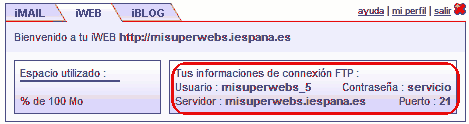 Por si no te gustan las otras opciones, paso a comentarte las características y cómo registrarte en iEspana.es. Te ofrecen 100 megas de espacio web, (no dice nada de la transferencia mensual que te da, o al menos yo no lo he encontrado...). Te dan también 1 base de datos MySql y una dirección email. Lo malo es que has de soportar su publicidad en cada una de tus páginas web. Lo bueno es que todo está en español....